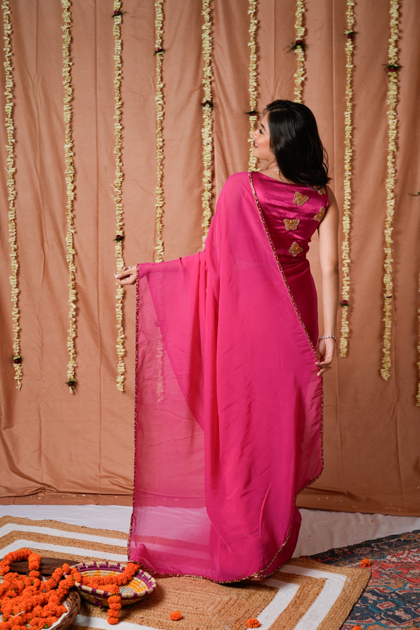 Blouse: The model is wearing size 34 of blouse BUTTERFLY EMBROIDERED MASHRU SILK BLOUSE.