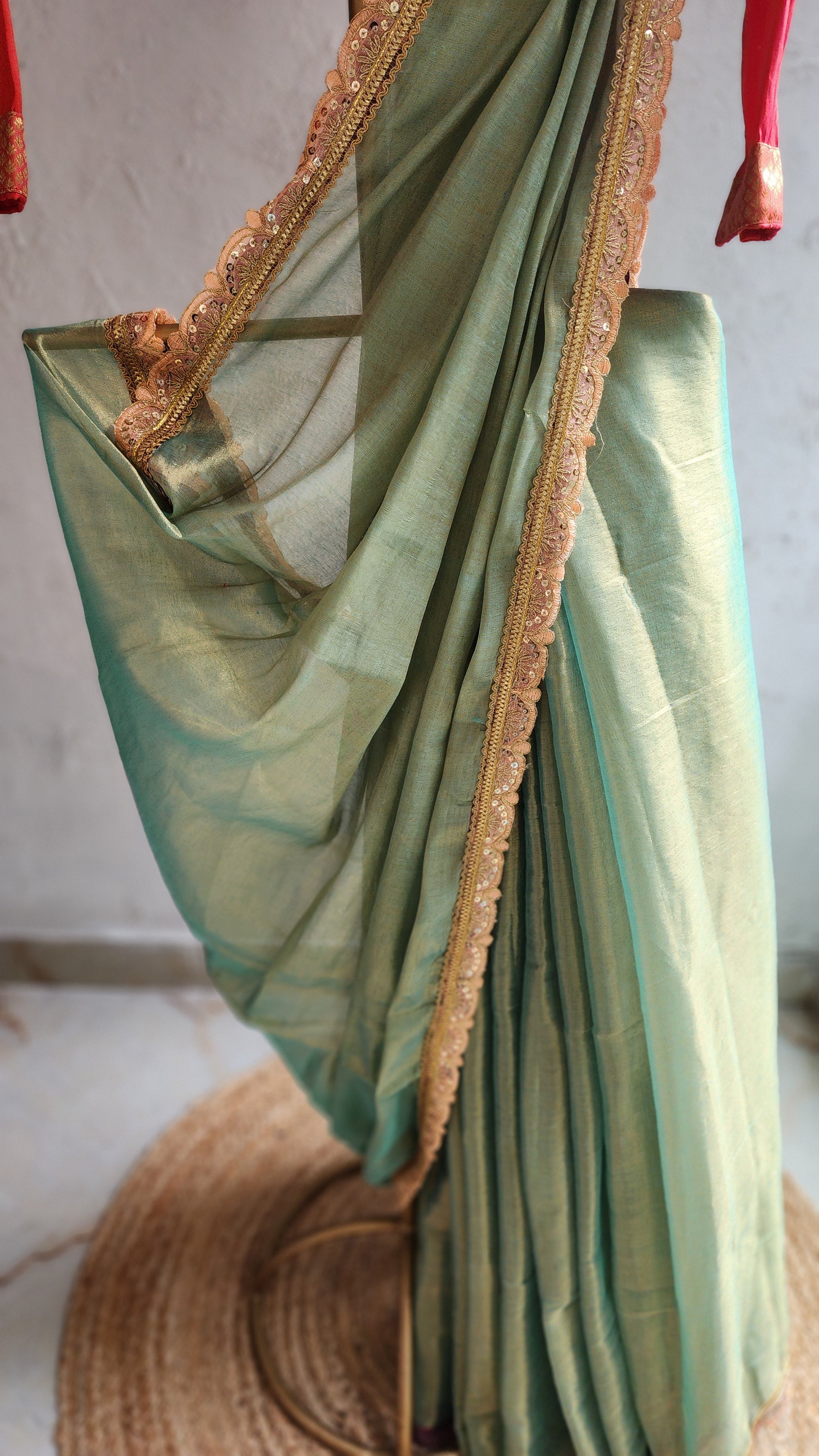 Introducing our Seema Gold Saree — a radiant drape crafted in tissue raga silk with a rich molten-gold sheen. The saree features a beautifully embellished scalloped border with hints of coral tassels that add just the right pop of festive charm. Paired here with our handcrafted orange-gold brocade blouse, this look is perfect for wedding functions, Sangeet nights, and every moment you want to feel like royalty.