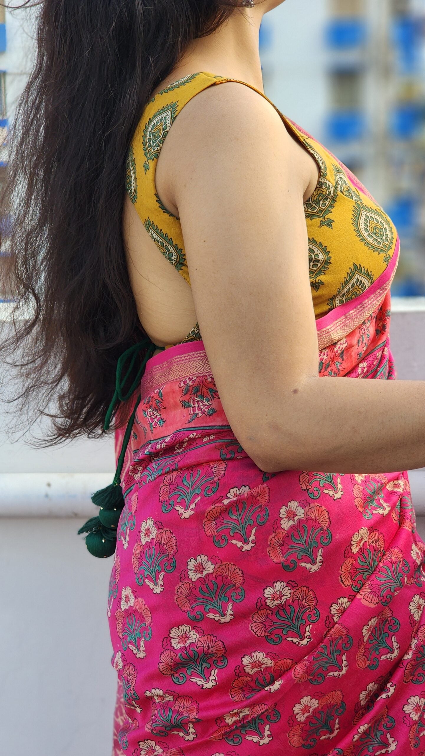 Disclaimer: The pictures are clicked in daylight. Color may vary slightly from the image due to the screen brightness. The model is wearing RANIBAGH CHANDERI COTTON SILK SAREE.