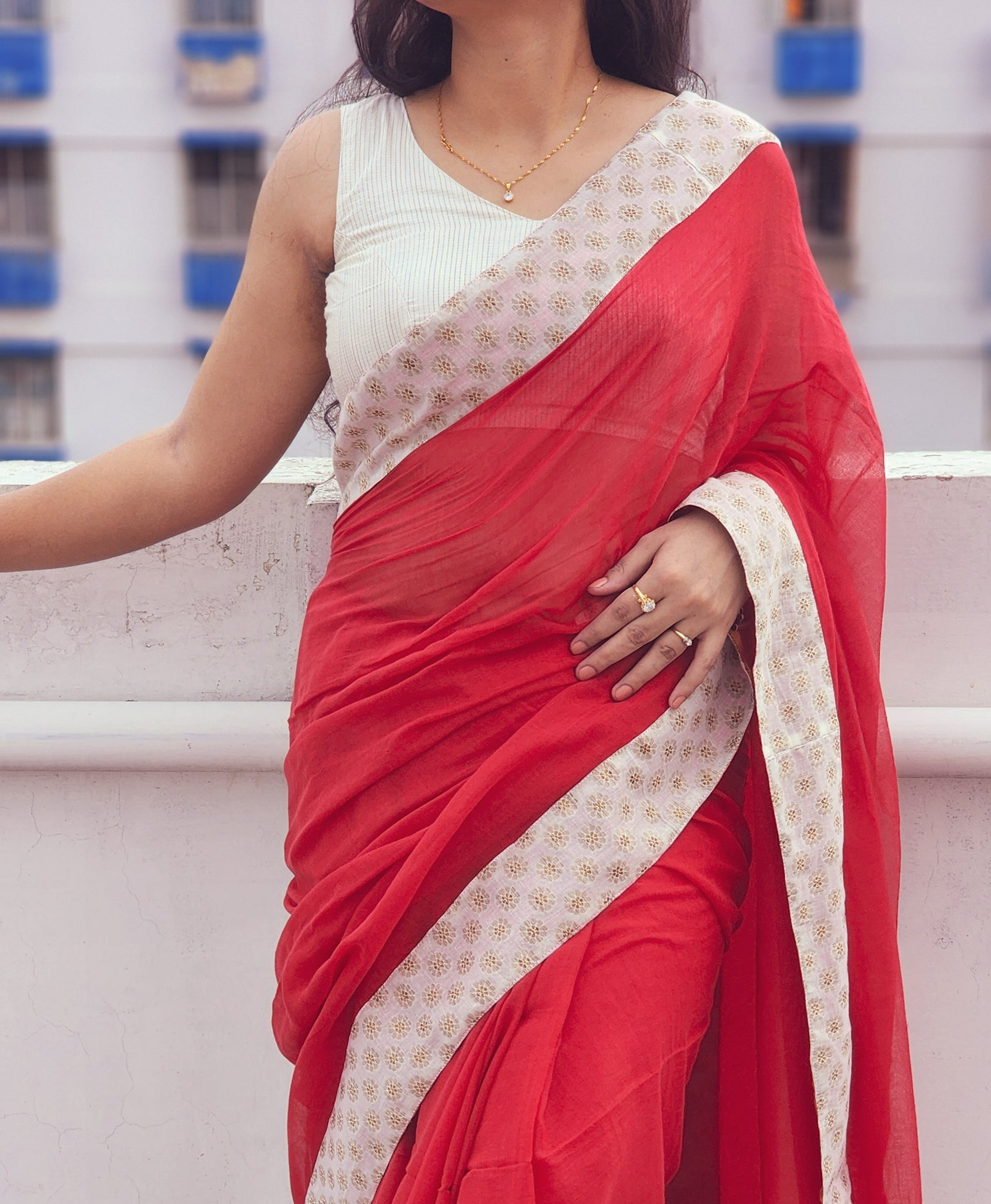Disclaimer: The pictures are clicked in daylight. Color may vary slightly from the image due to the screen brightness. The model is wearing RED WHITE PATCHWORK MUL COTTON SAREE.